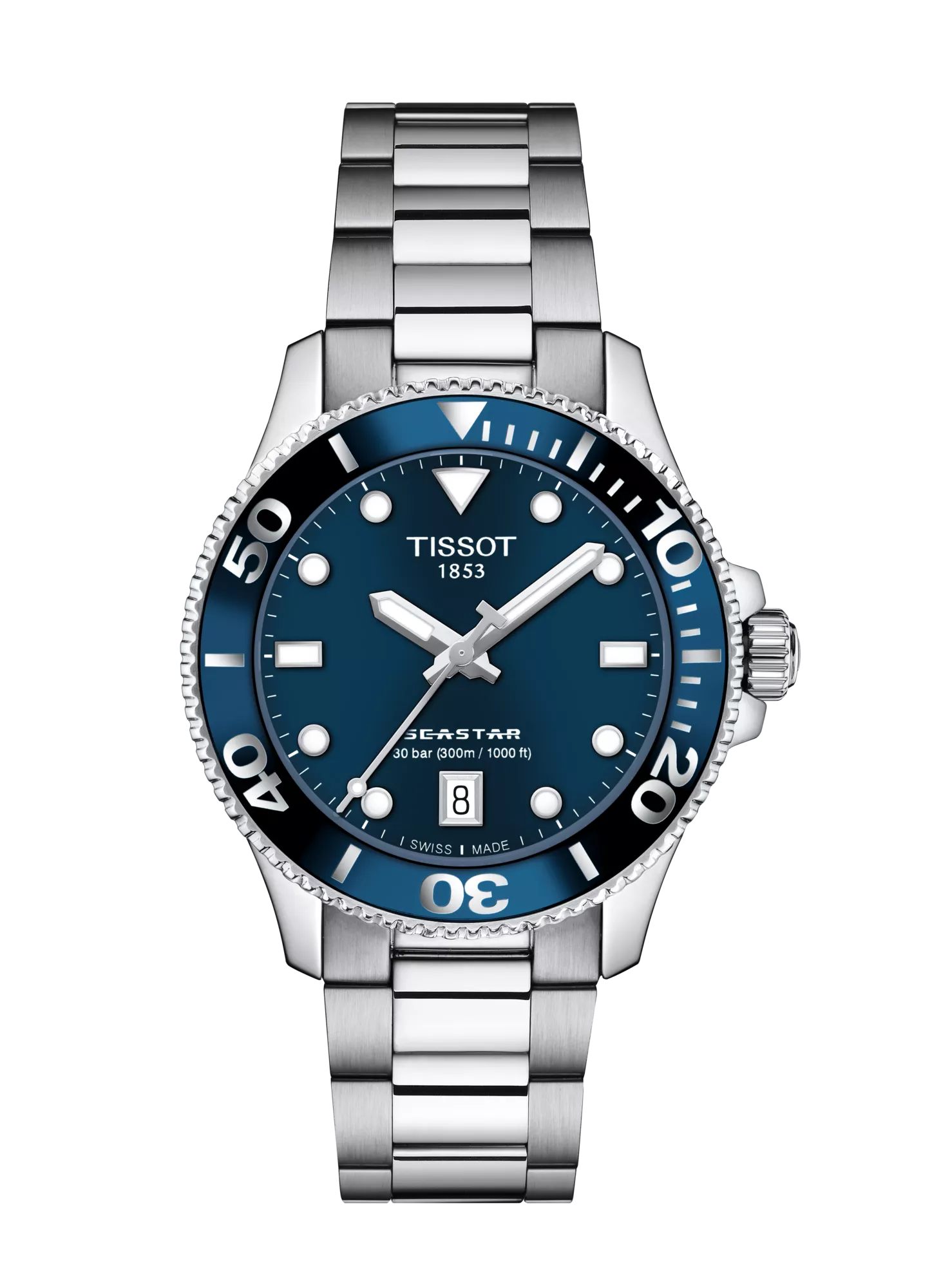 In crystal clear waters, you can see the sun's rays breaking through the surface. In your mind, only calm. On your wrist, the Seastar 1000, the door to this underwater world. It’s chic, assertive and versatile. Whether you choose the black, blue or white lacquered dial, it comes with a stainless steel case and bracelet, a uni-directional rotating bezel with a mineral glass insert, a screw-down crown and water resistance up to 30 bar (300m / 1000ft)). And if you want, you can quickly switch the bracelet for an orange, white, light-blue or black silicone strap. Change your outlook and step into another world.