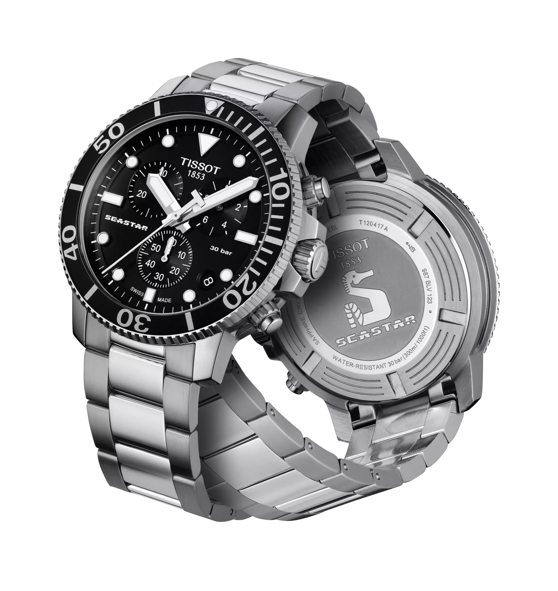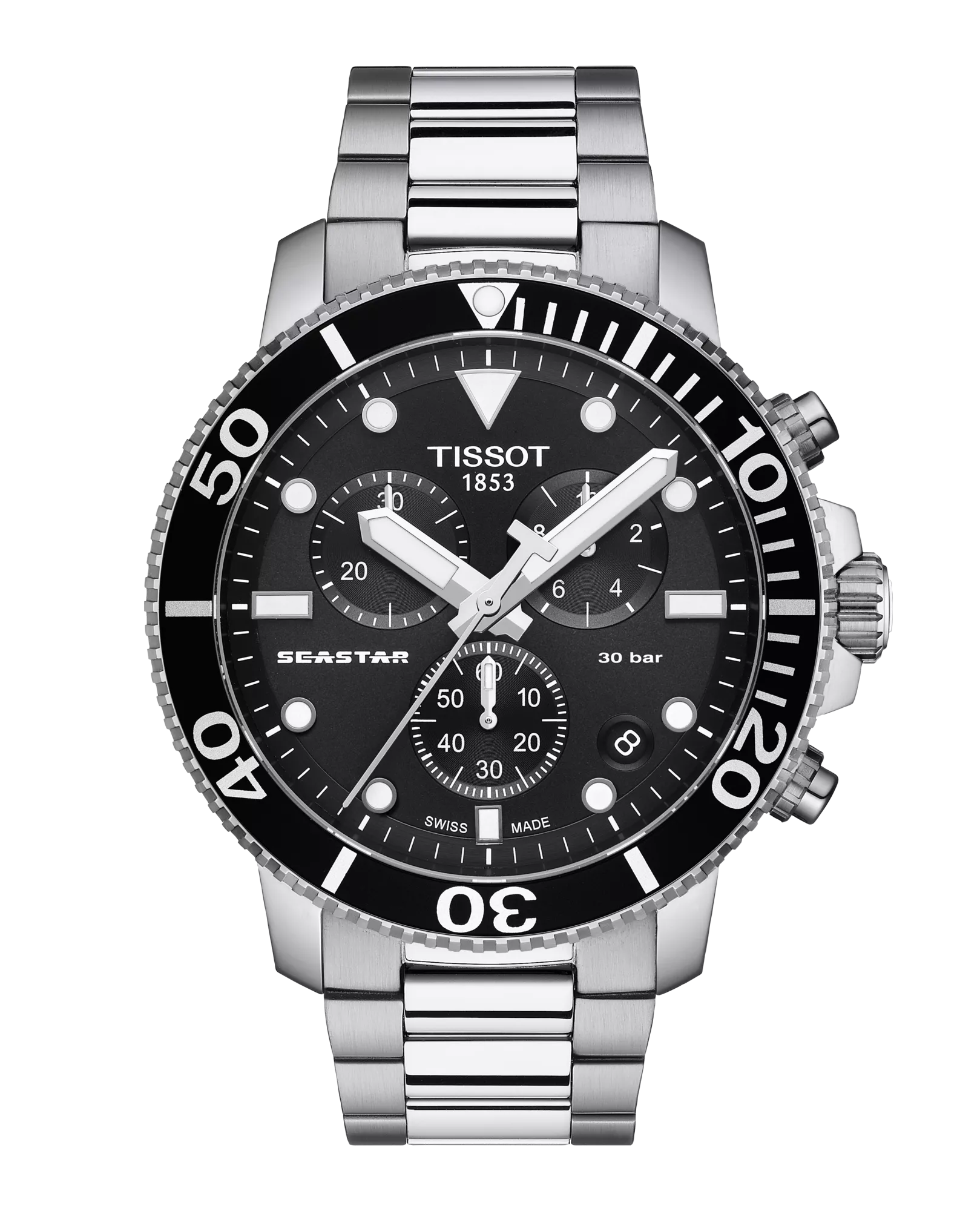 The Tissot Seastar 1000 merges style and performance without compromising either. The diving inspiration shapes both the appearance and the functionality of this watch. It maintains its performance to a pressure of 30 bar (300m/1'000ft), combining underwater sports and a preference for a sophisticated Swiss timepiece.