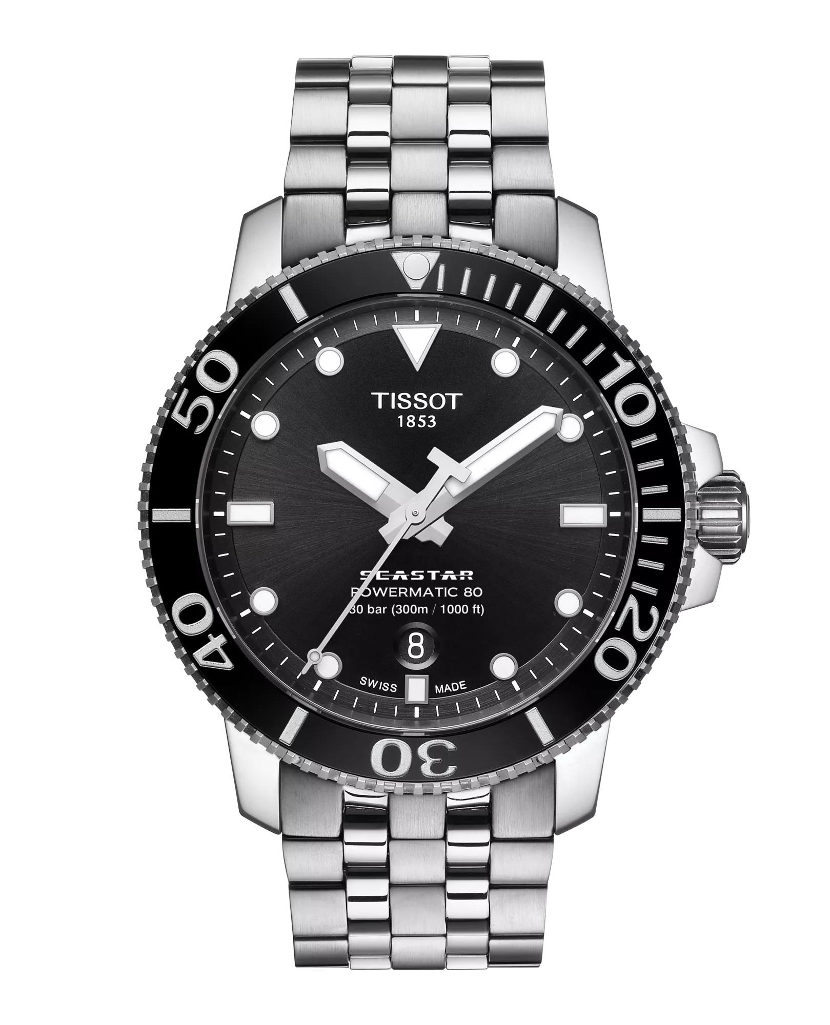 The Tissot Seastar 1000 with bright details and ceramic bezel merges style and performance without diluting either. The water-sport inspiration shapes both the appearance and the functionality of this watch. It maintains its performance underwater to a pressure of 30 bar (300 m / 1000 ft). Combining high-performance with style, the Tissot Seastar 1000 will be loved by water-sports lovers. Now combined with the energy of the Powermatic 80 automatic movement for up to 80 hours of autonomy.